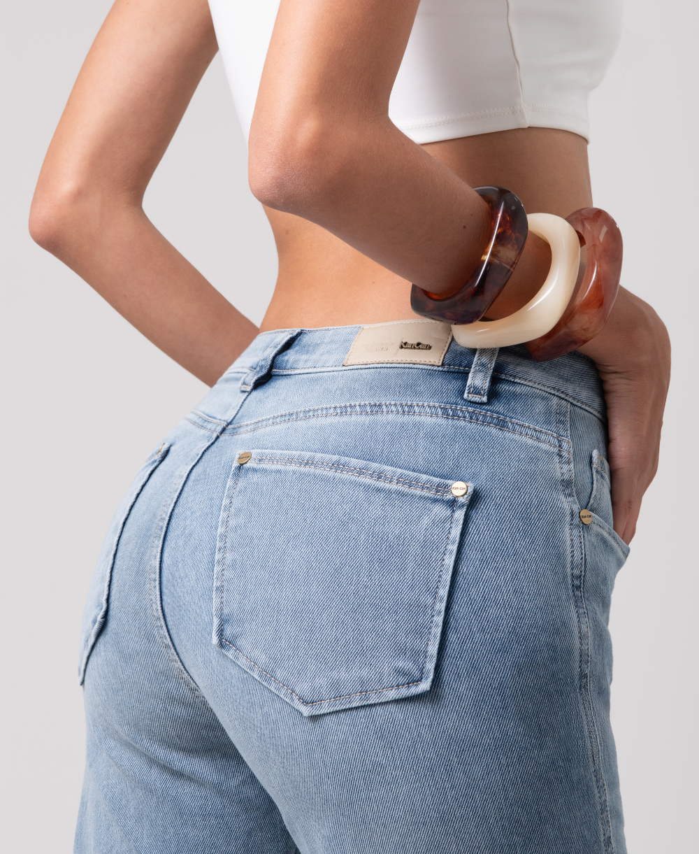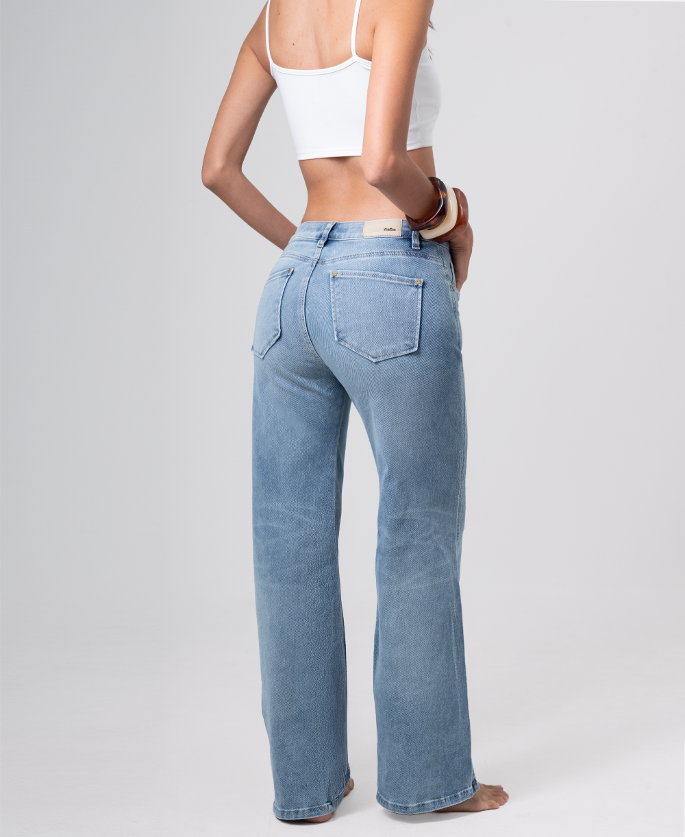Jean Staight de tiro alto confeccionado en denim azul claro. Su silueta de pierna amplia estiliza la figura y brinda comodidad. Cuenta con cierre frontal con botón metálico, bolsillos funcionales y detalle de abertura lateral en el ruedo que aporta un toque moderno. Ideal para looks casuales y en tendencia.