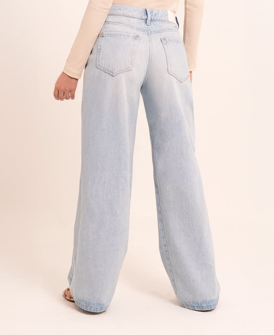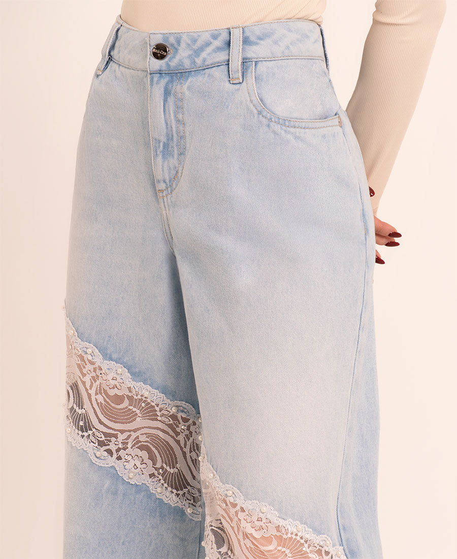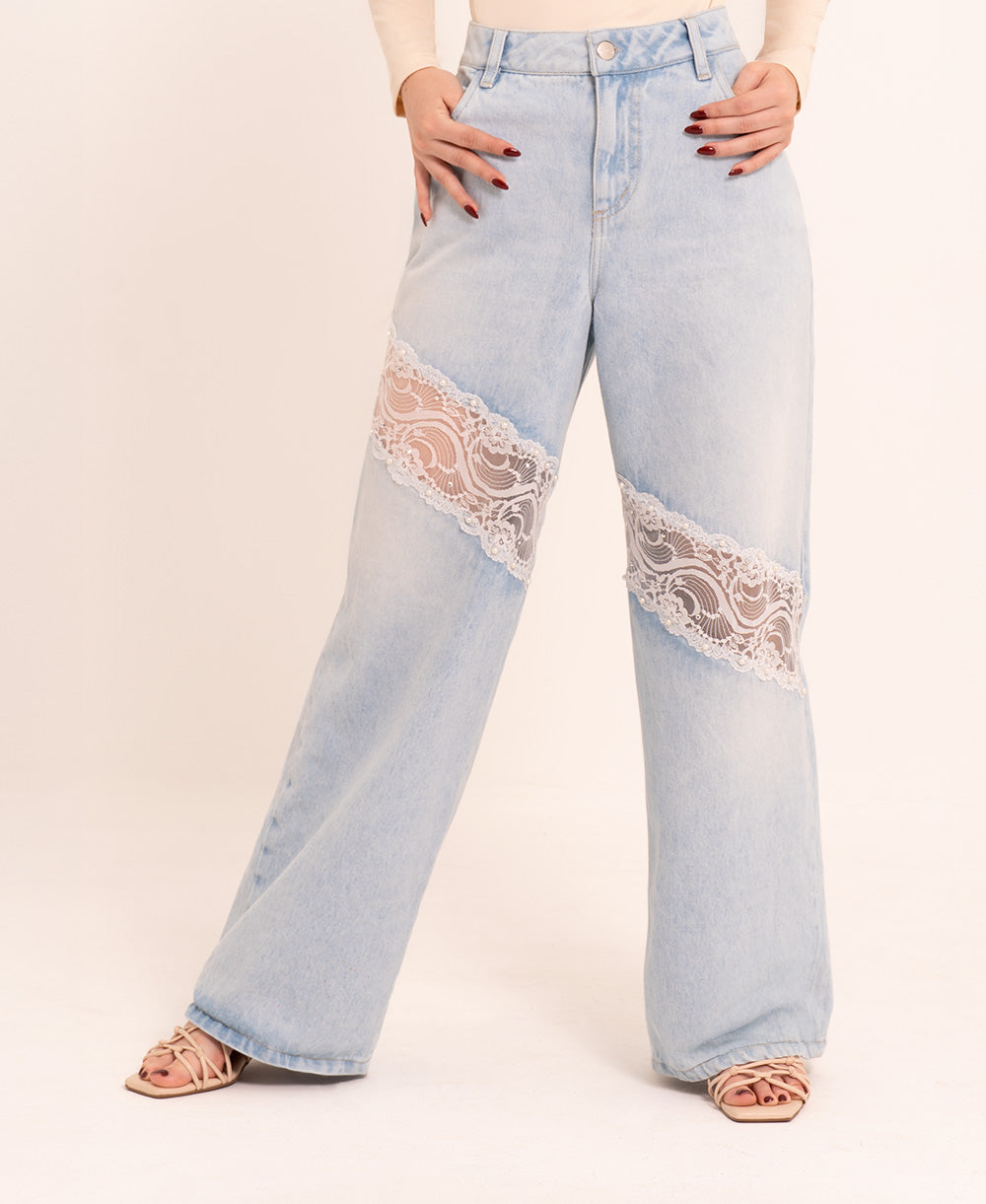 Jean wide leg en denim azul claro con aplicaciones de encaje blanco en las piernas, que aportan un contraste delicado y femenino. Su tiro alto estiliza la silueta y el corte amplio ofrece comodidad y movimiento. Una prenda versátil que fusiona el estilo clásico del denim con un toque romántico y sofisticado.