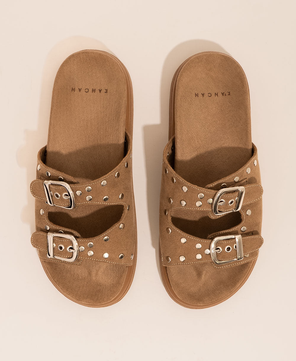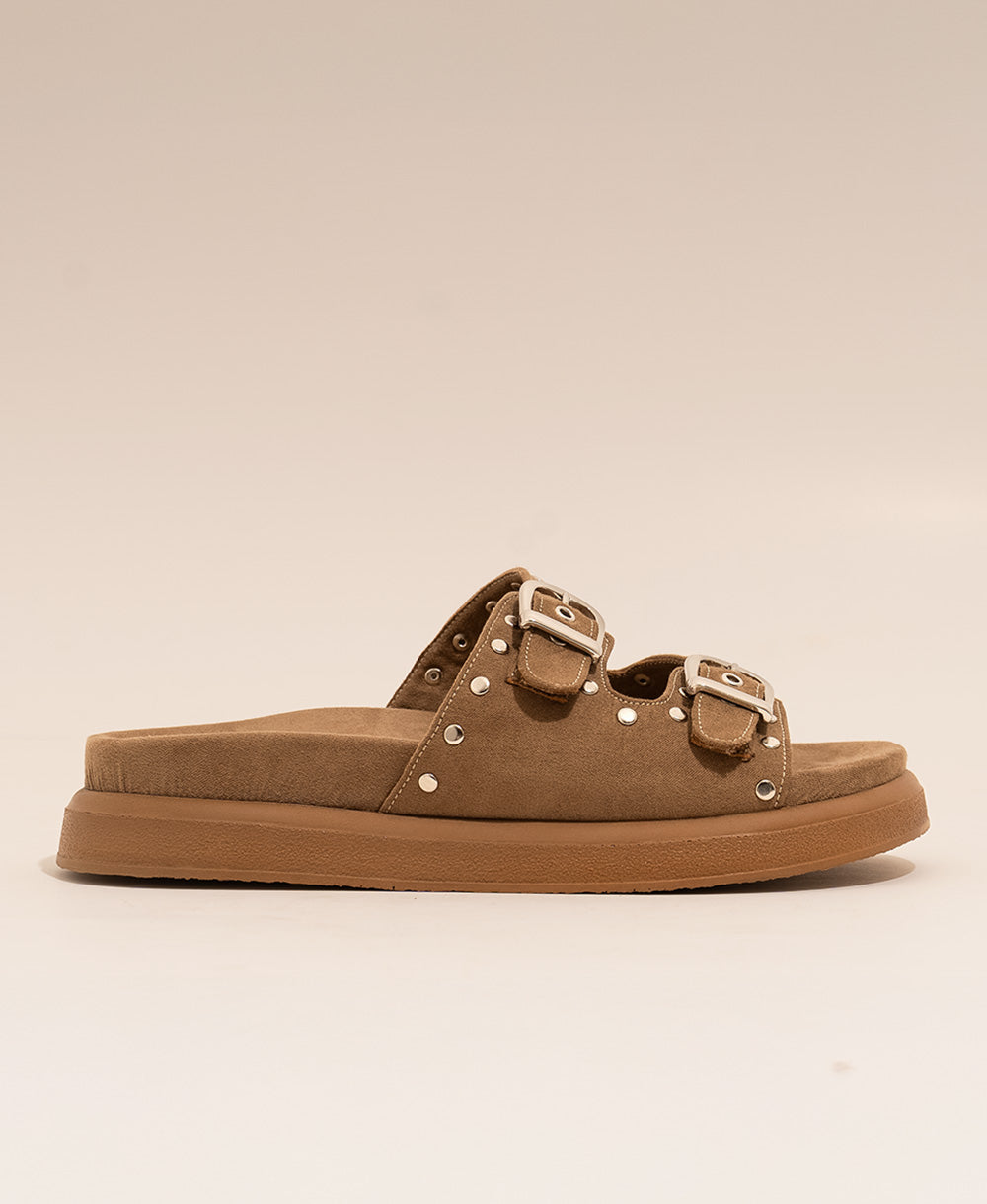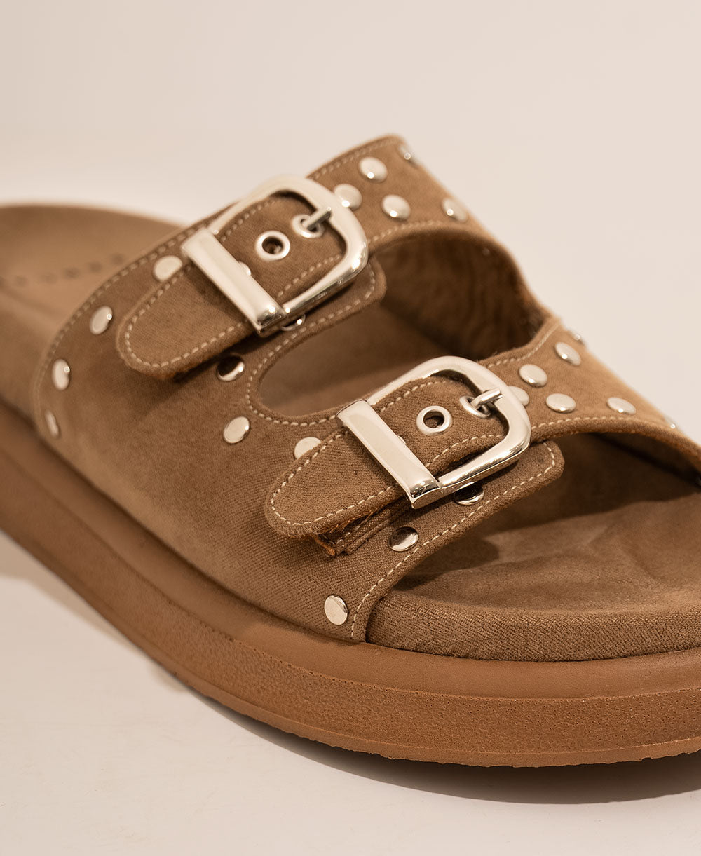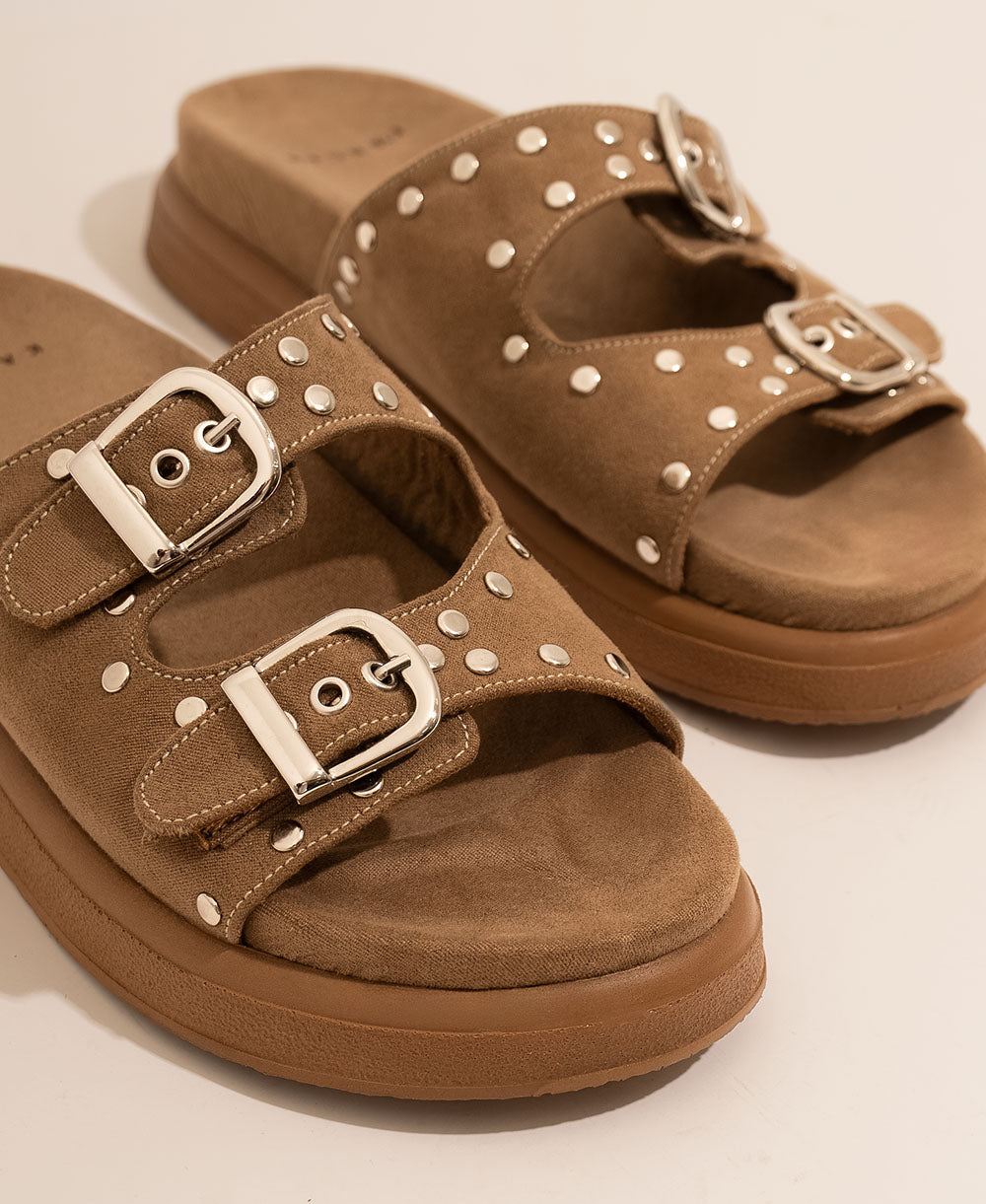 Sandalias tipo bio en acabado cafe. Diseñadas con dos correas ajustables con hebillas metálicas y detalles de taches plateados que aportan un toque rock chic. Su plantilla acolchada y suela ligera brindan confort durante todo el día, mientras que su diseño versátil combina perfectamente con jeans, vestidos y outfits casuales.