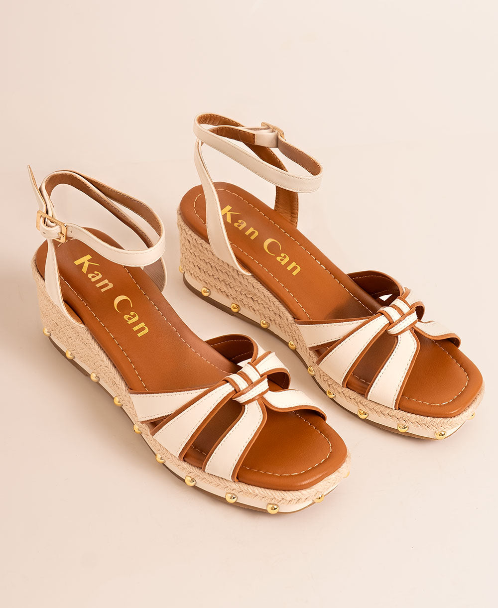 Sandalia Plataforma blanco con tiras finas en piel sintética natural. Apliques metálicos en tonos dorado y grafito que aportan carácter y contraste. Cierre con hebilla al tobillo.
