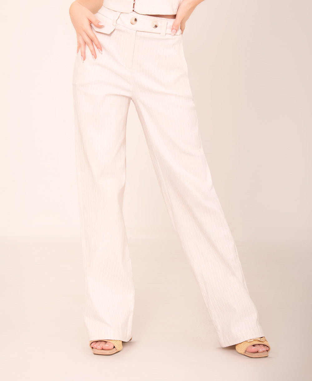 Set en tono avena con delicadas rayas verticales, ideal para lograr un look fresco y estilizado. El top de tiras delgadas con escote en forma de corazón y detalle de botones frontales aporta un aire romántico y femenino. El pantalón de tiro alto y corte recto equilibra la silueta con un toque de sofisticación. Un conjunto versátil que se adapta tanto a ocasiones casuales como elegantes.