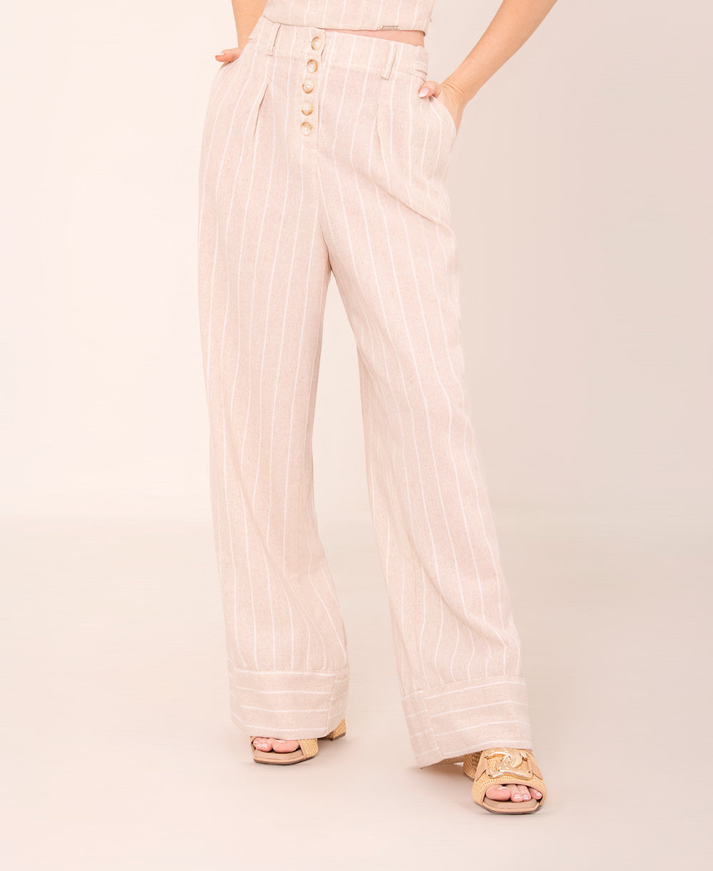 Set en tono beige con delicadas rayas verticales que estilizan la figura. El top de tiras anchas y escote corazón aporta un aire femenino y sofisticado, mientras que el pantalón de tiro alto con corte recto y botonadura frontal decorativa brinda un ajuste elegante y moderno. Un conjunto versátil que combina frescura y estilo para cualquier ocasión.