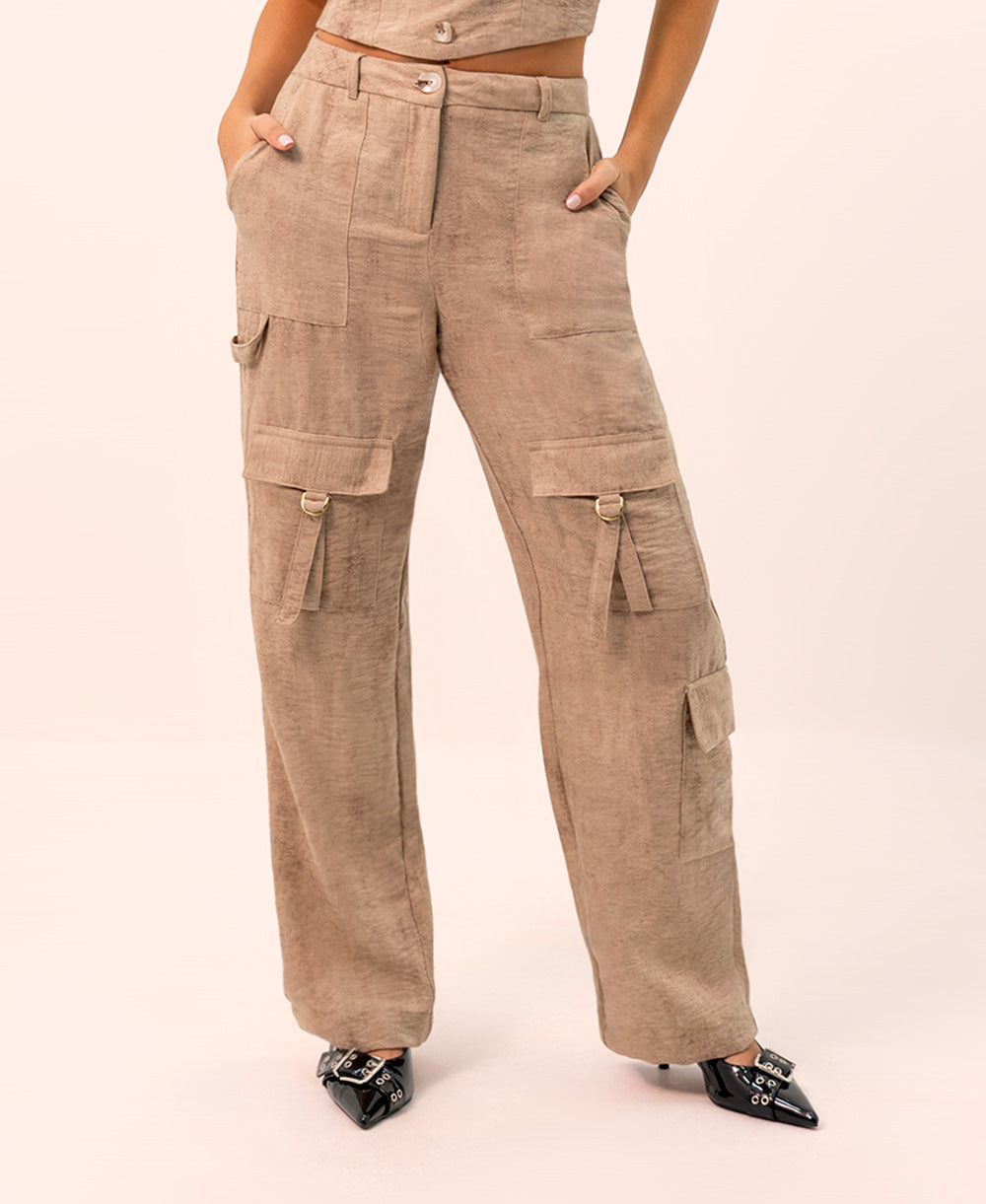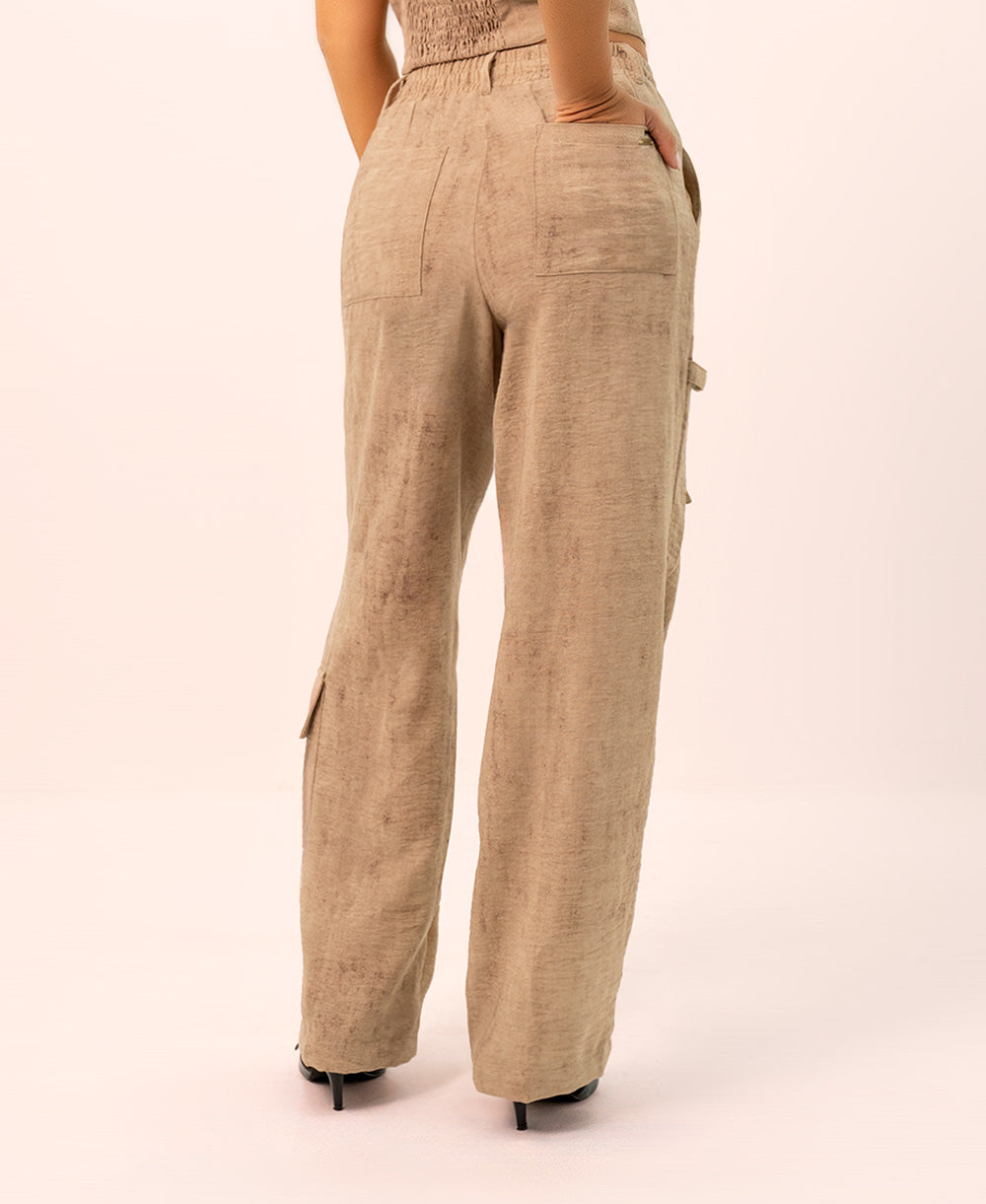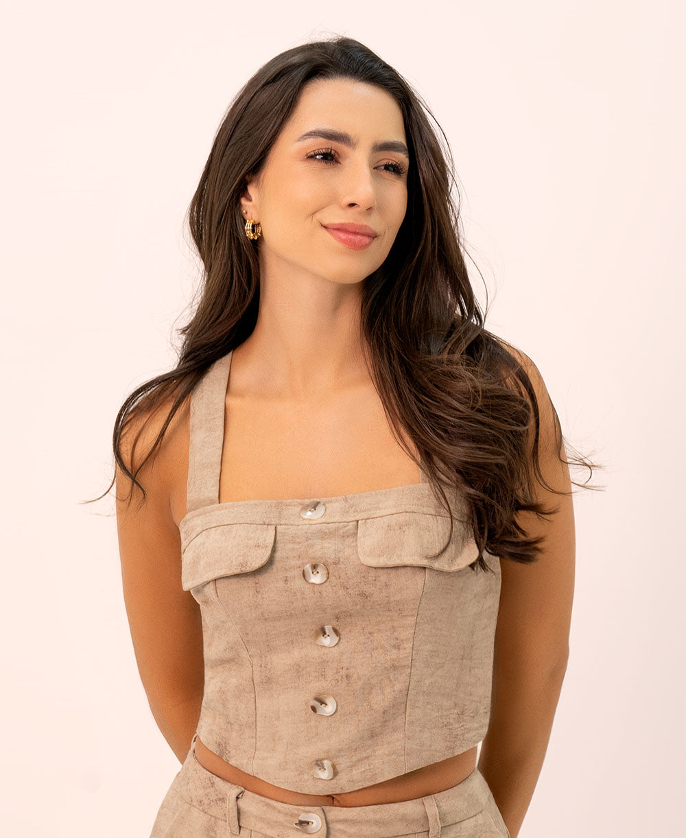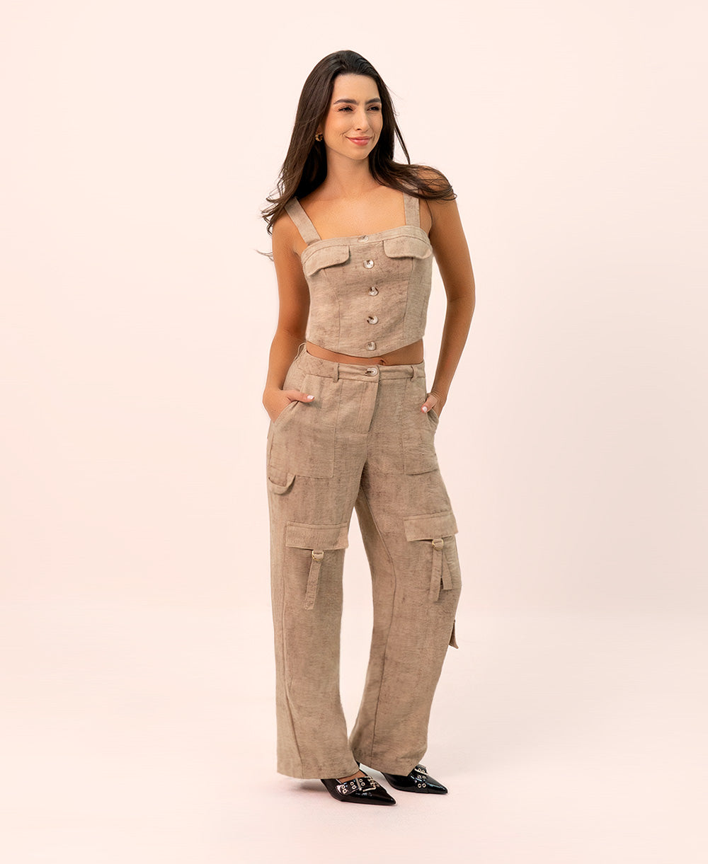 Set en lino en tono kaki, con efecto vintage compuesto por Croptop tipo corset y pantalón cargo wide leg. El top incluye tirantes anchos y botones metálicos que estructuran la silueta, mientras que el pantalón aporta frescura con bolsillos cargo y caída fluida. Un look moderno, cómodo y sofisticado para elevar tu estilo diario.