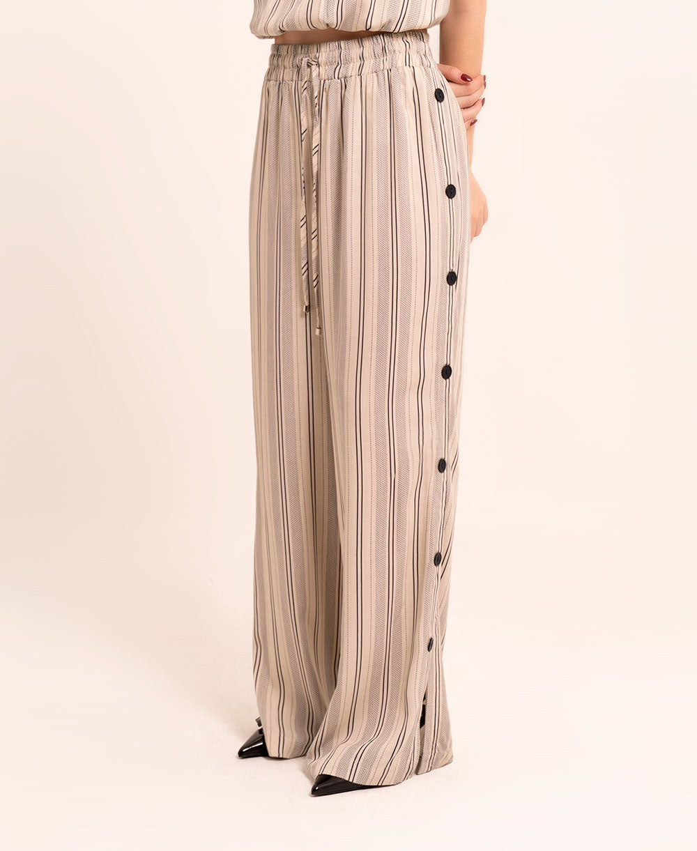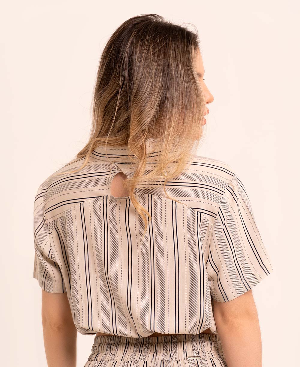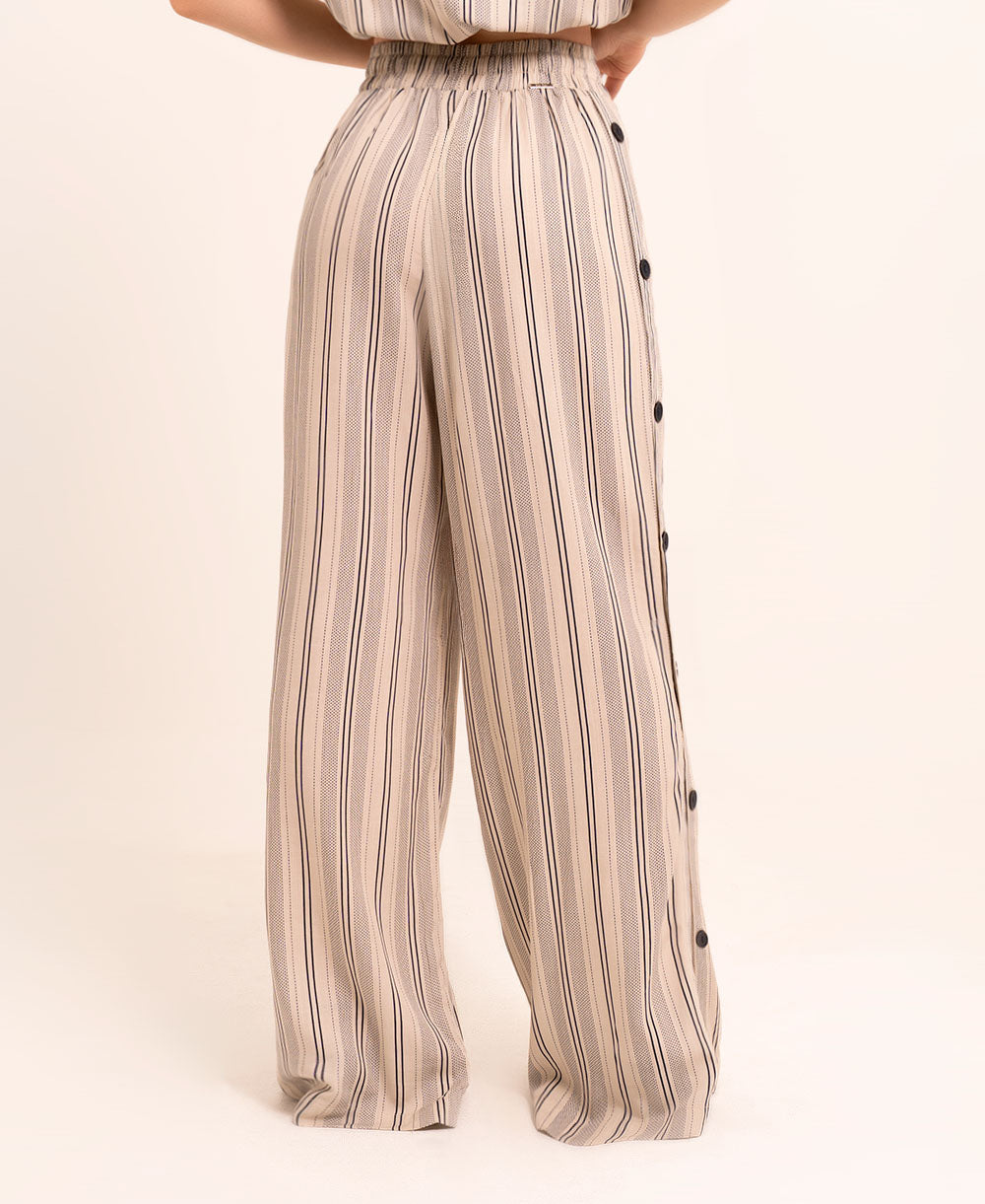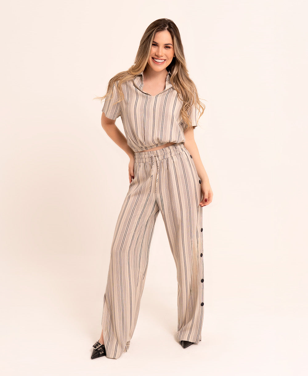 Set de blusa y pantalón con diseño de rayas verticales que estilizan la figura y aportan un aire fresco y elegante. La blusa tipo crop con cuello camisero equilibra comodidad y estilo, mientras que el pantalón de silueta wide leg y pretina elástica ofrece libertad de movimiento y un fit relajado. Un look versátil y moderno, ideal para destacar en días soleados o planes casual chic.