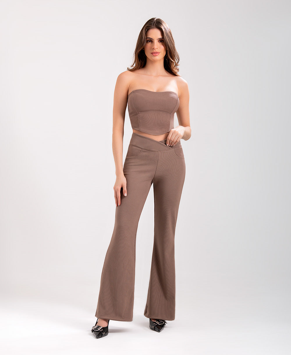 Conjunto dos piezas en tono mocca que combina un croptop tipo corset, ajustado y estructurado, con un pantalón de tiro alto y cintura cruzada, de corte flare que estiliza la figura y aporta un look moderno y sofisticado.