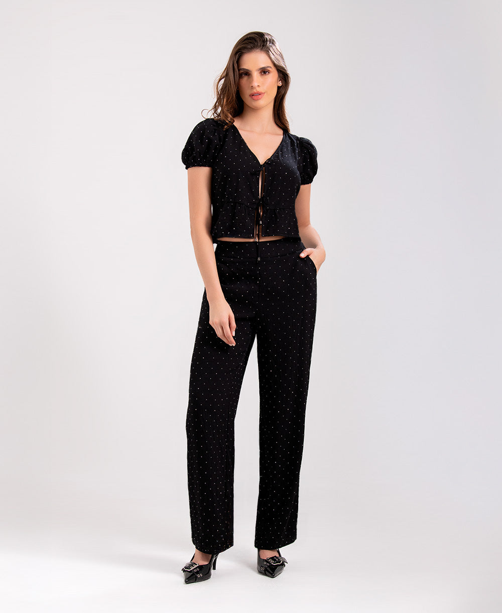 Este set dos piezas está confeccionado en tejido crepé plumeti con microtextura y acabado ligeramente satinado, lo que aporta un brillo sutil y elegante. La parte superior es una blusa de escote en V, con mangas tipo globo y delicado detalle de amarre frontal que añade un toque femenino y moderno. El pantalón es de tiro alto y bota recta, diseñado para estilizar la figura manteniendo total comodidad. El patrón de mini puntos en relieve distribuidos sobre toda la prenda realza su look sofisticado y versátil, ideal para día o noche.