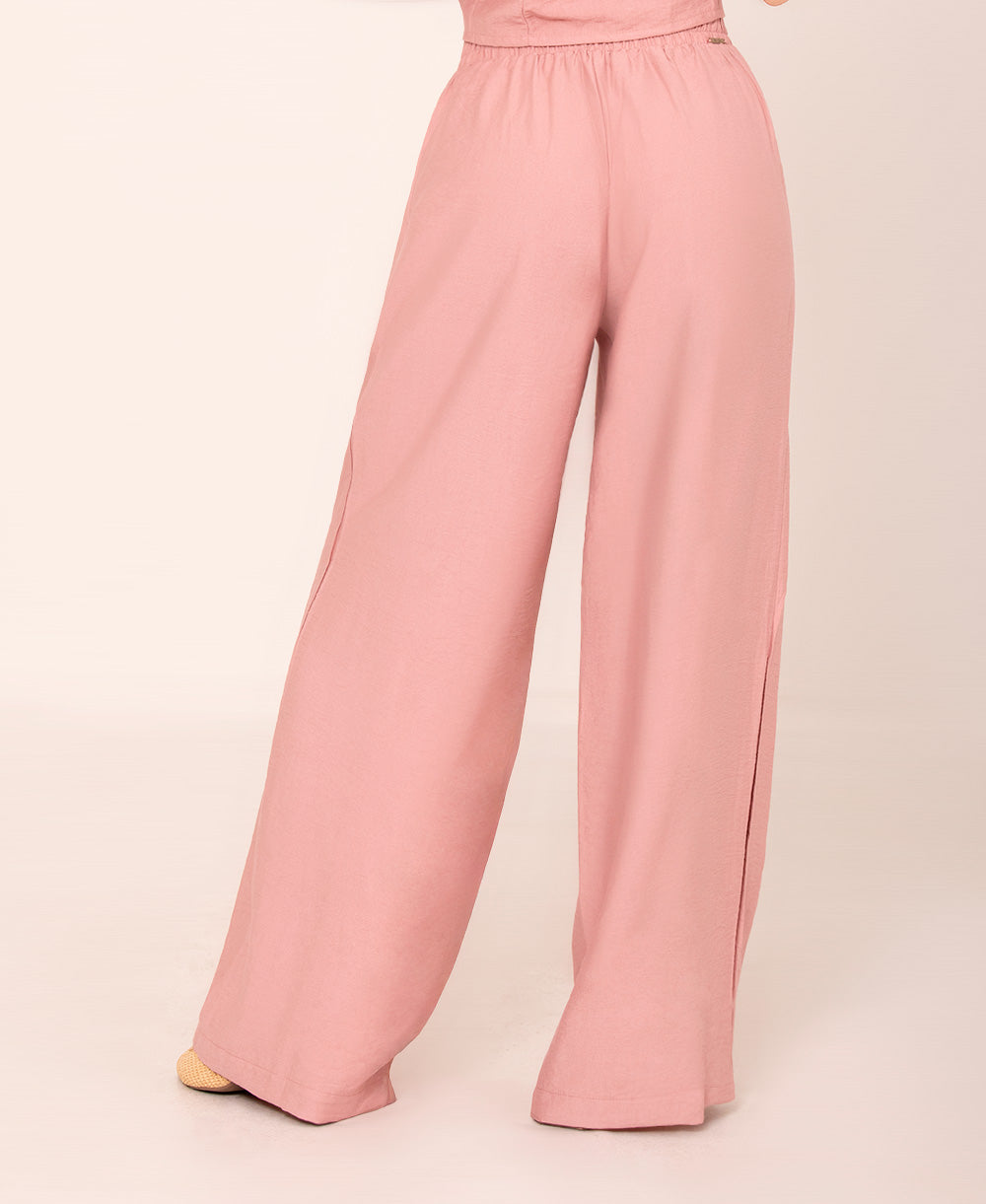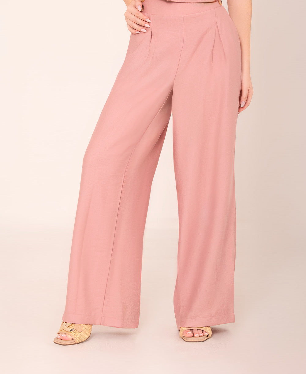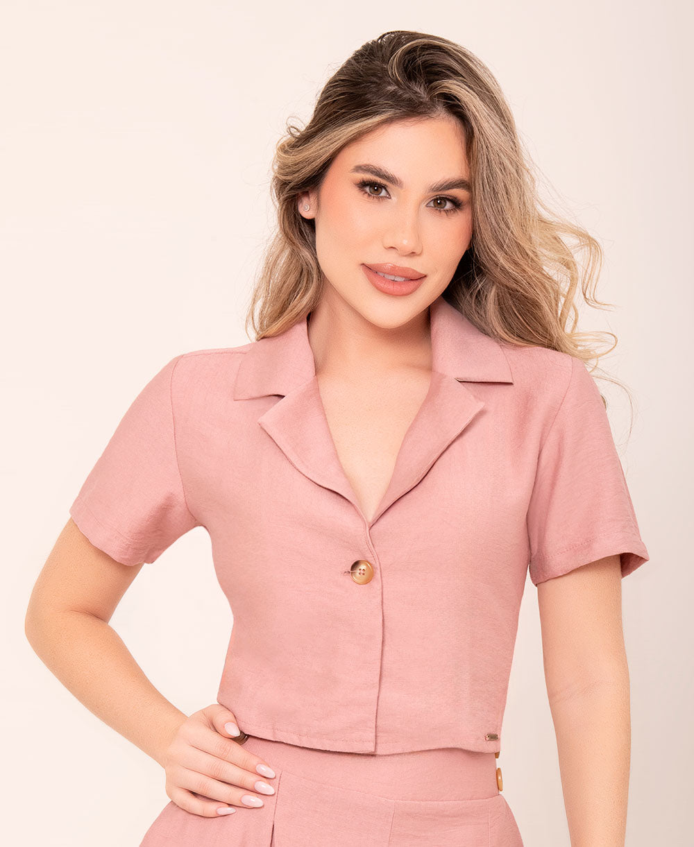Set en tono rosa empolvado con un estilo sofisticado y versátil. La blusa tipo camisa de manga corta con cuello clásico y botones frontales aporta un aire elegante y moderno, mientras que el pantalón de tiro alto con pinzas y corte ancho estiliza la silueta y garantiza comodidad. Una propuesta perfecta para ocasiones casuales chic o reuniones donde quieras lucir fresca y con estilo.