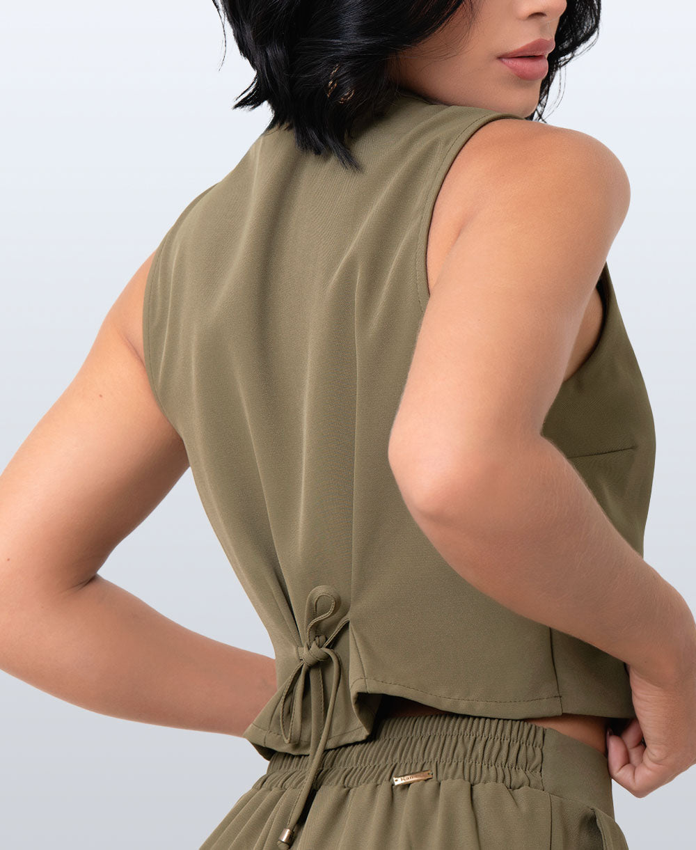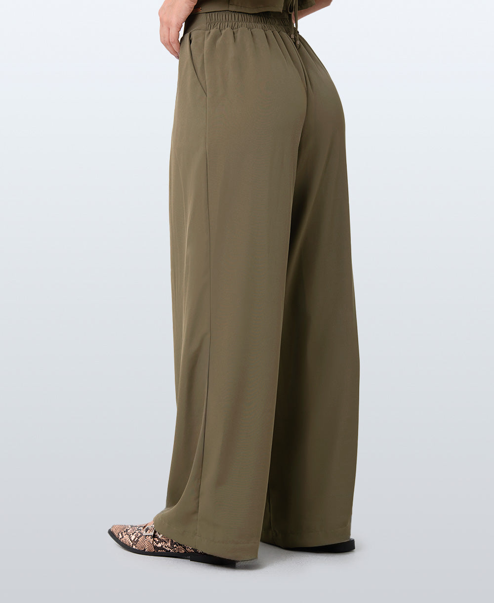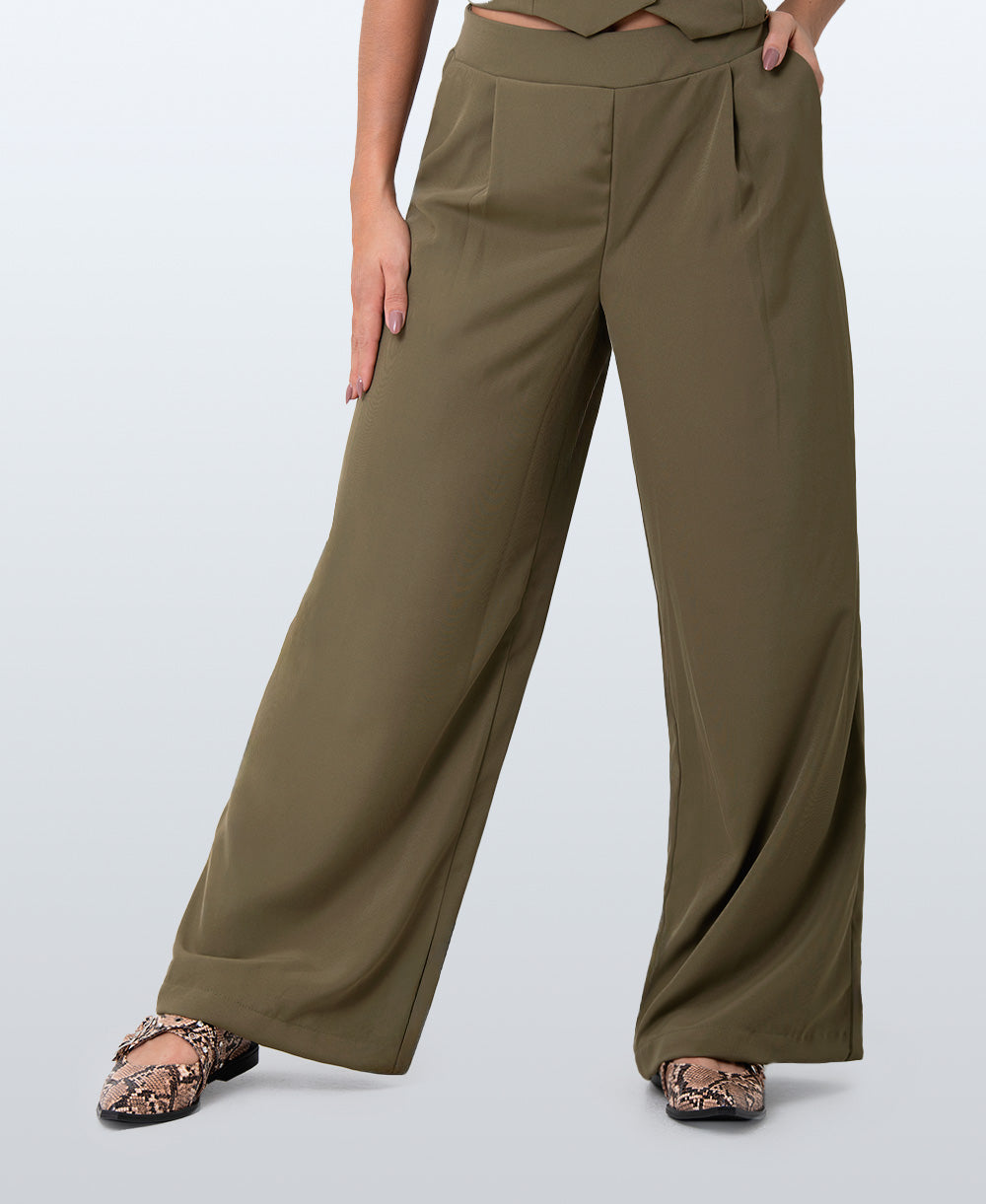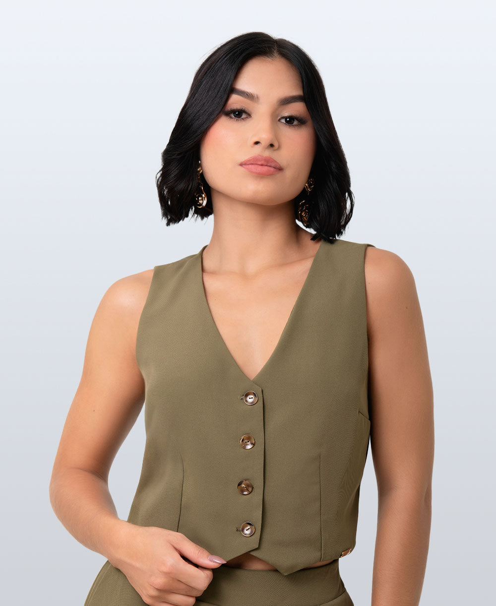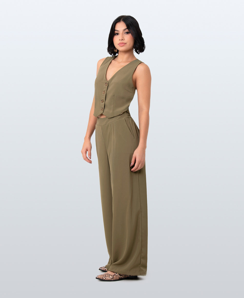 set verde militar. Este conjunto combina un chaleco tipo sastre con botones y un pantalón palazo de tiro alto, logrando un look sofisticado, moderno y cómodo. Ideal para crear looks monocromáticos o contrastar con tonos neutros.