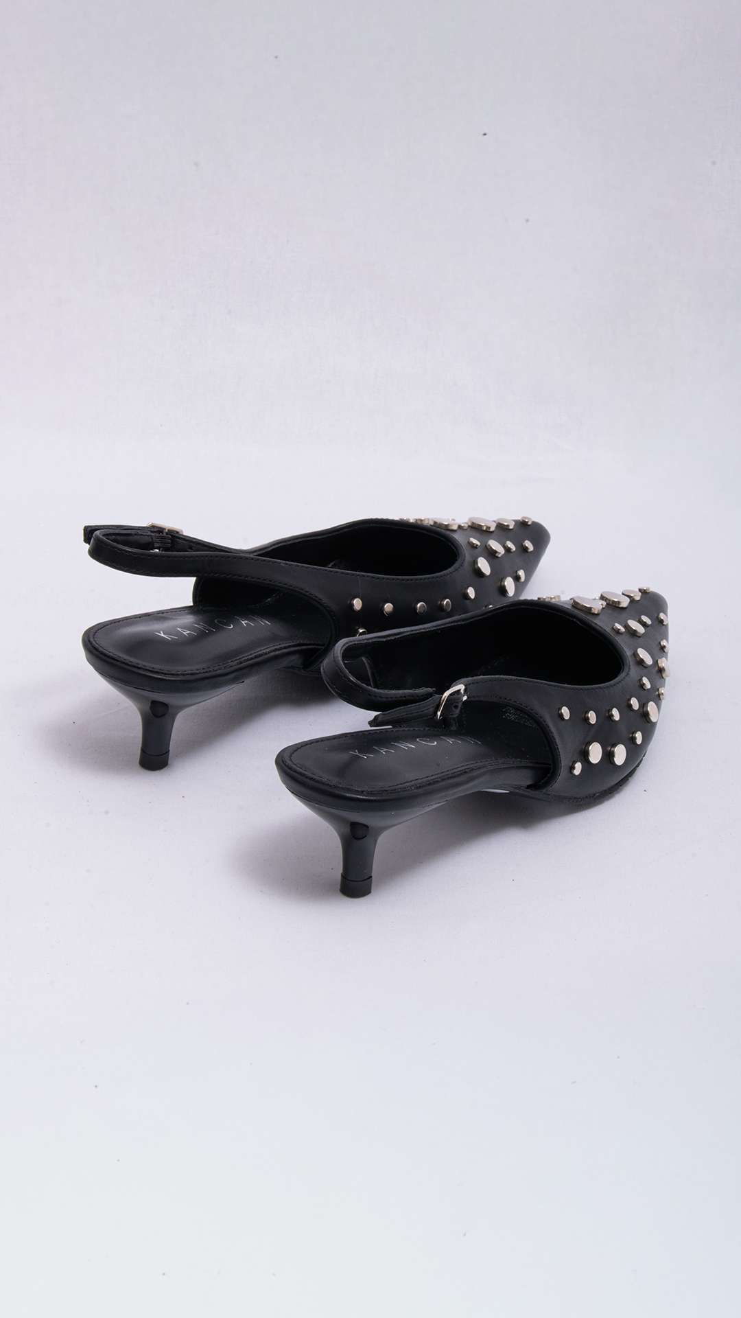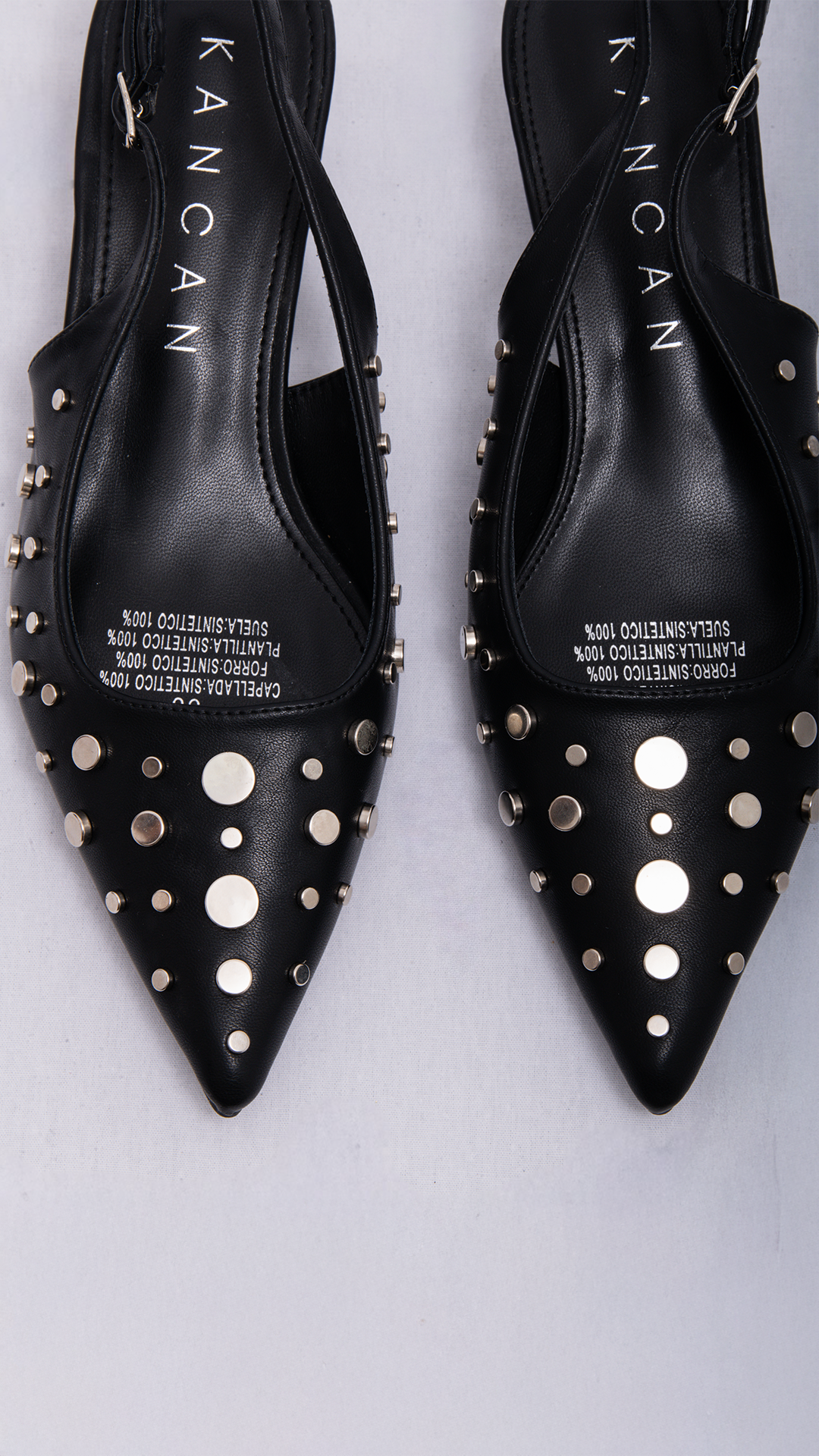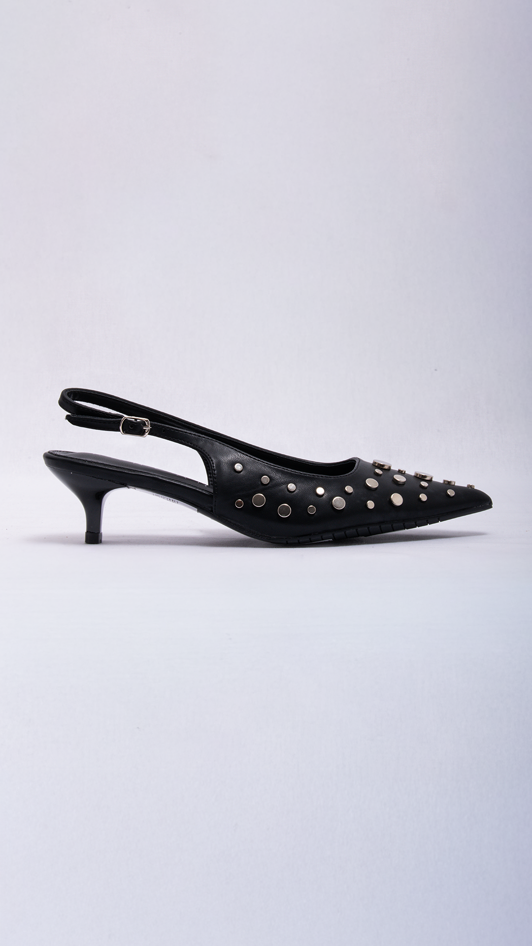 Stilettos negro en charol, destaca por su diseño en punta y taches decorativos. Su tacón medio estiliza tu figura sin sacrificar comodidad. Ideal para elevar tus looks de día o noche.