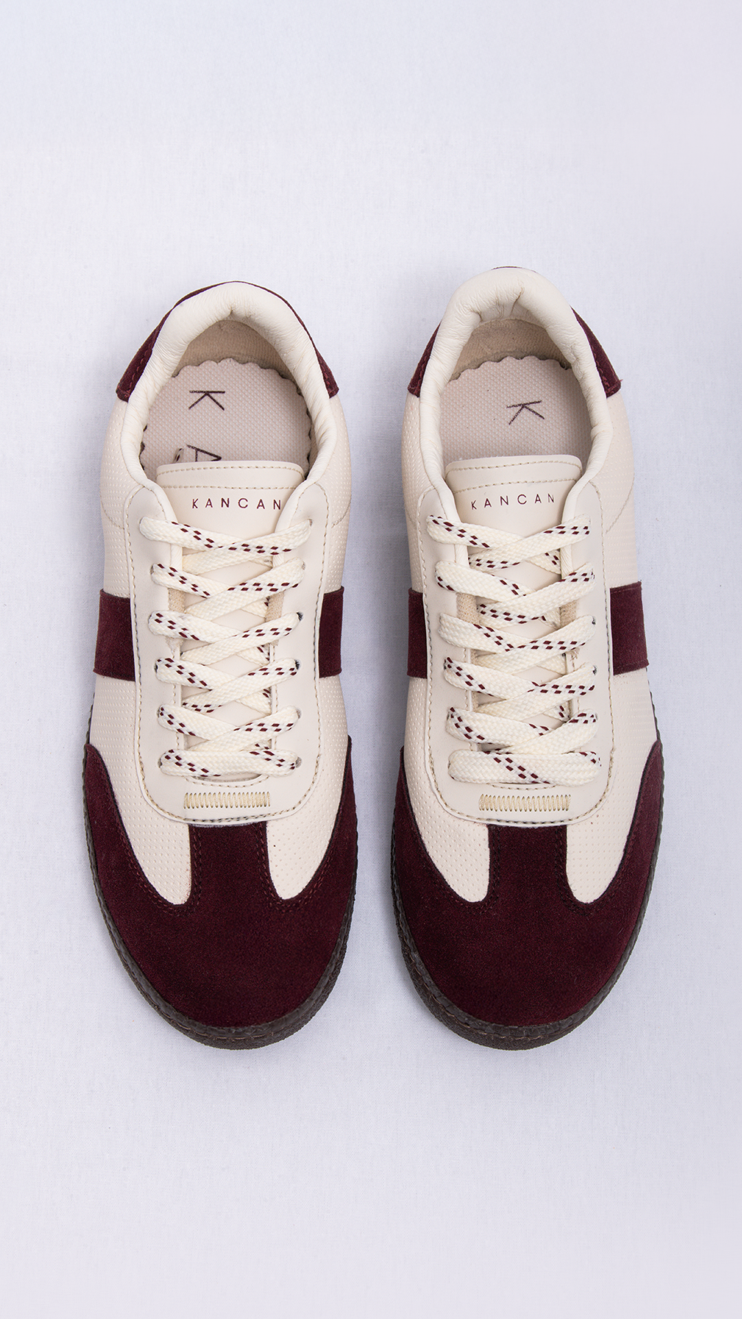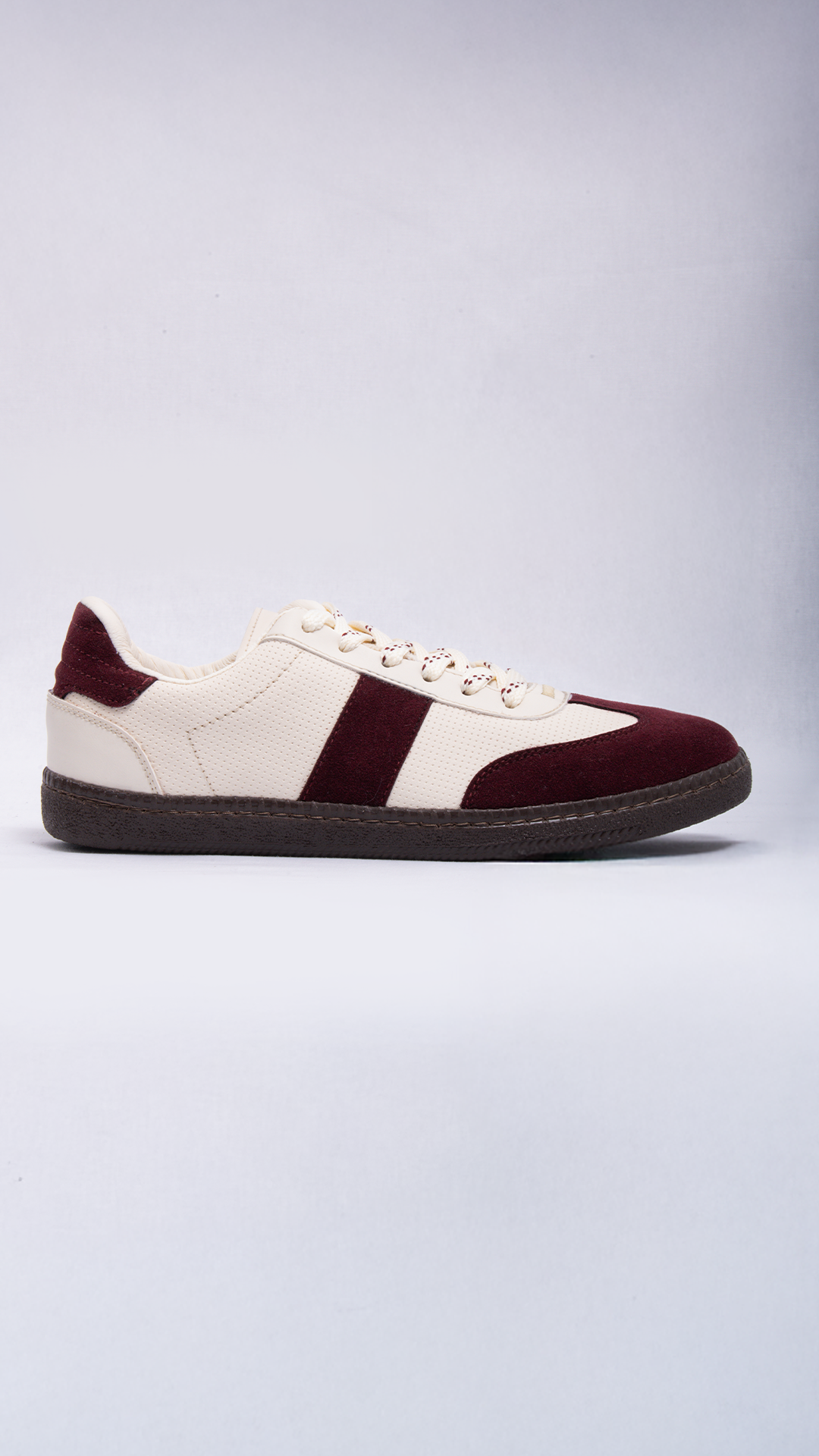 Zapatilla de estilo casual con silueta baja y diseño moderno en contraste. Elaborado en combinación de materiales sintéticos y textil, con paneles en tono marfil y detalles en color vinotinto que aportan carácter y estilo. Cuenta con puntera reforzada, cordones al frente para un ajuste cómodo y suela plana en color oscuro que brinda estabilidad y confort en el uso diario. Ideal para looks urbanos y casuales con un toque sofisticado.
